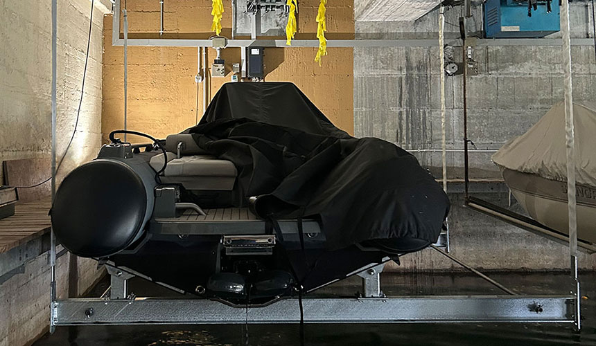 Diese 4-Punkt-Bootsliftanlage wurde für eine bestehende Bootshalle konzipiert, in der ältere Liftsysteme schrittweise durch moderne Technik ersetzt werden. Der neue Lift verfügt über kompakte Hubgetriebe, die über dem Steg angeordnet sind. Dies erleichtert die Wartung und spart Kosten.