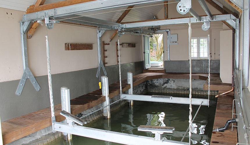 5'000kg 4-Punkt Hydraulik Bootslift mit Stahlunterkonstruktion zur Entlastung der Gebäudekonstruktion.
