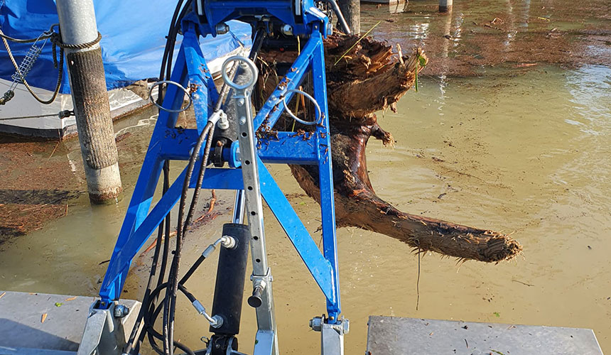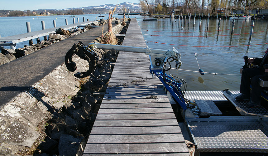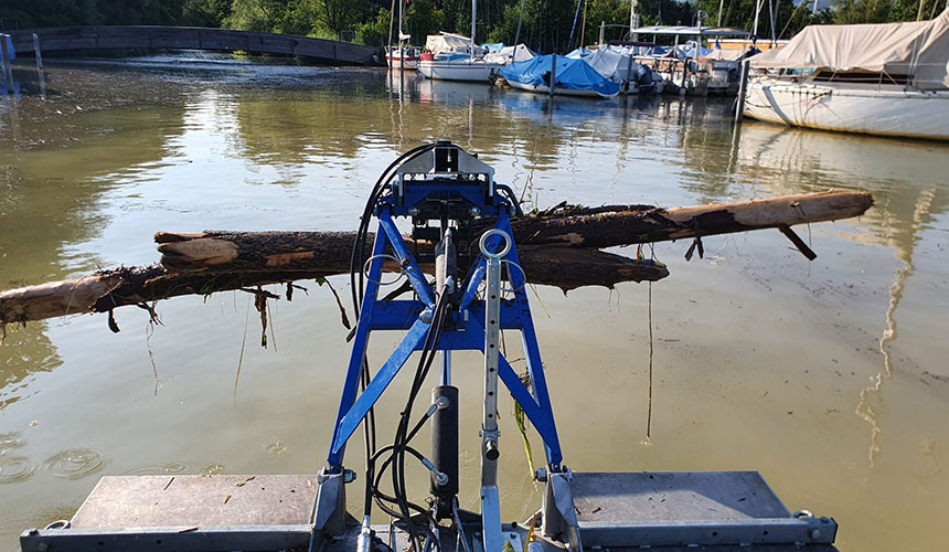 Mit dem Greiffer werden Holzstämme und Steine aus dem Wasser gehoben.